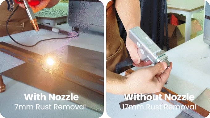 Wenn Sie vom Laserschweißen/-schneiden zum Laserreinigen wechseln müssen, können Sie einfach das Einsetzwerkzeug für den Fokussierspiegel und die Reinigungsdüse austauschen und direkt zum Abisolieren übergehen.